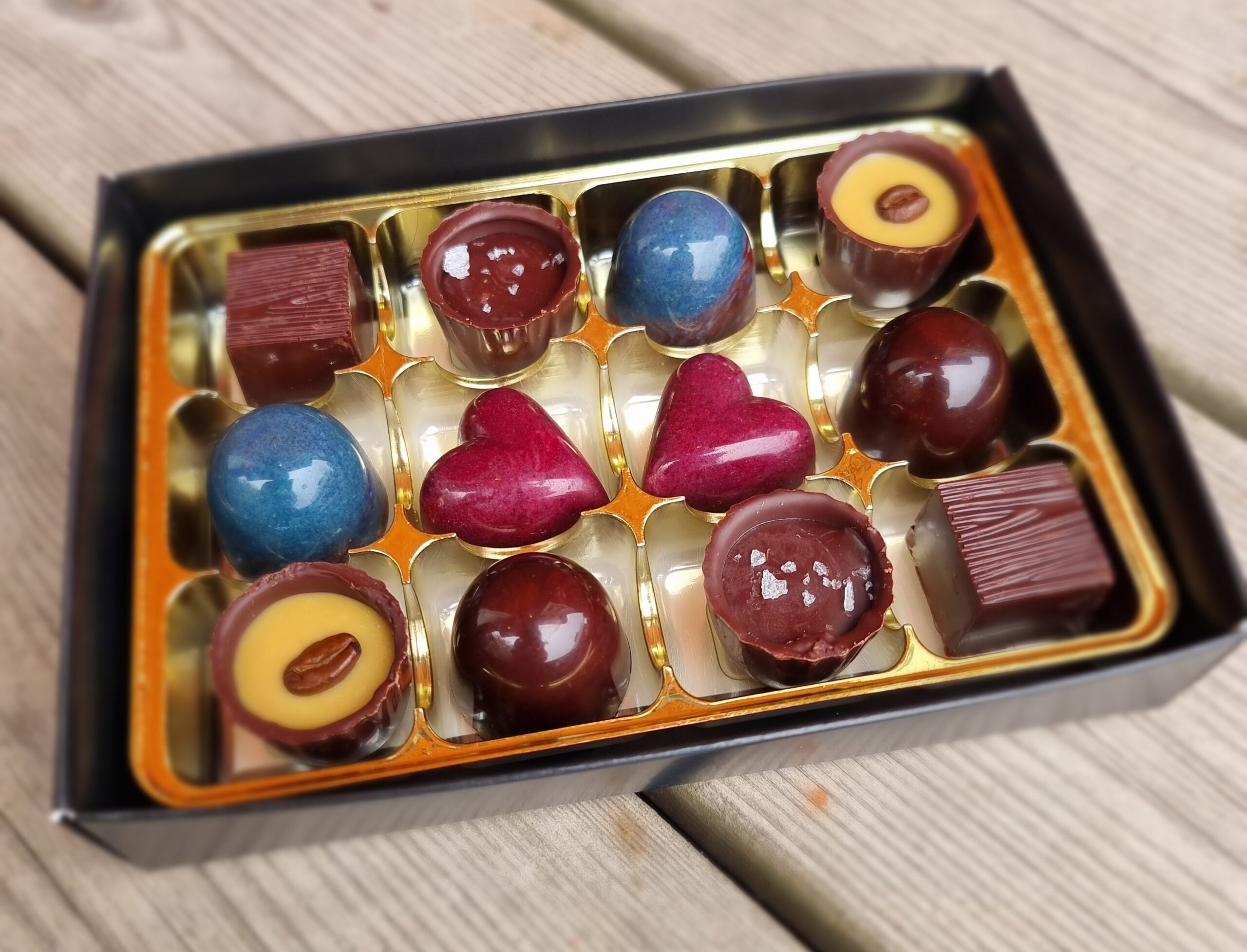 Ingredienser: Mörk choklad* (kakaomassa*, rörsocker*. kakaosmör*), vit choklad*(socker*, kakaosmör*, MJÖLKpulver*, vanilj*), lingon*, blåbär*, GRÄDDE*, socker*, MJÖLKchoklad* (socker*, kakaosmör*, MJÖLKpulver*, kakaomassa*), MANDEL*, sirap*, SMÖR*, glukossirap*, kaffe*, salt, vaniljsocker*, kaffebönor*, kardemumma*, havssalt, gurkmeja*, blå spirulina*, hallonpulver*, hibiskuspulver*