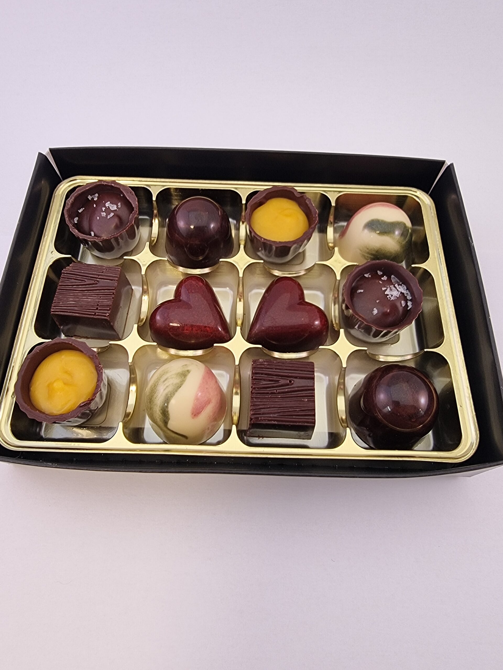 Ingredienser: Mörk choklad* (kakaomassa*, rörsocker*. kakaosmör*), vit choklad* (socker*, kakaosmör*, MJÖLKpulver*, vanilj*), mangopuré, hallonpuré, rabarber, GRÄDDE, socker*, MJÖLKchoklad* (socker*, kakaosmör*, MJÖLKpulver*, kakaomassa*), MANDEL*, sirap*, SMÖR, glukossirap, VETE-mjöl, citronjuice, salt, vaniljsocker*, havssalt, citronzest, gurkmeja*, hallonpulver*, hibiskuspulver*, spirulinapulver*