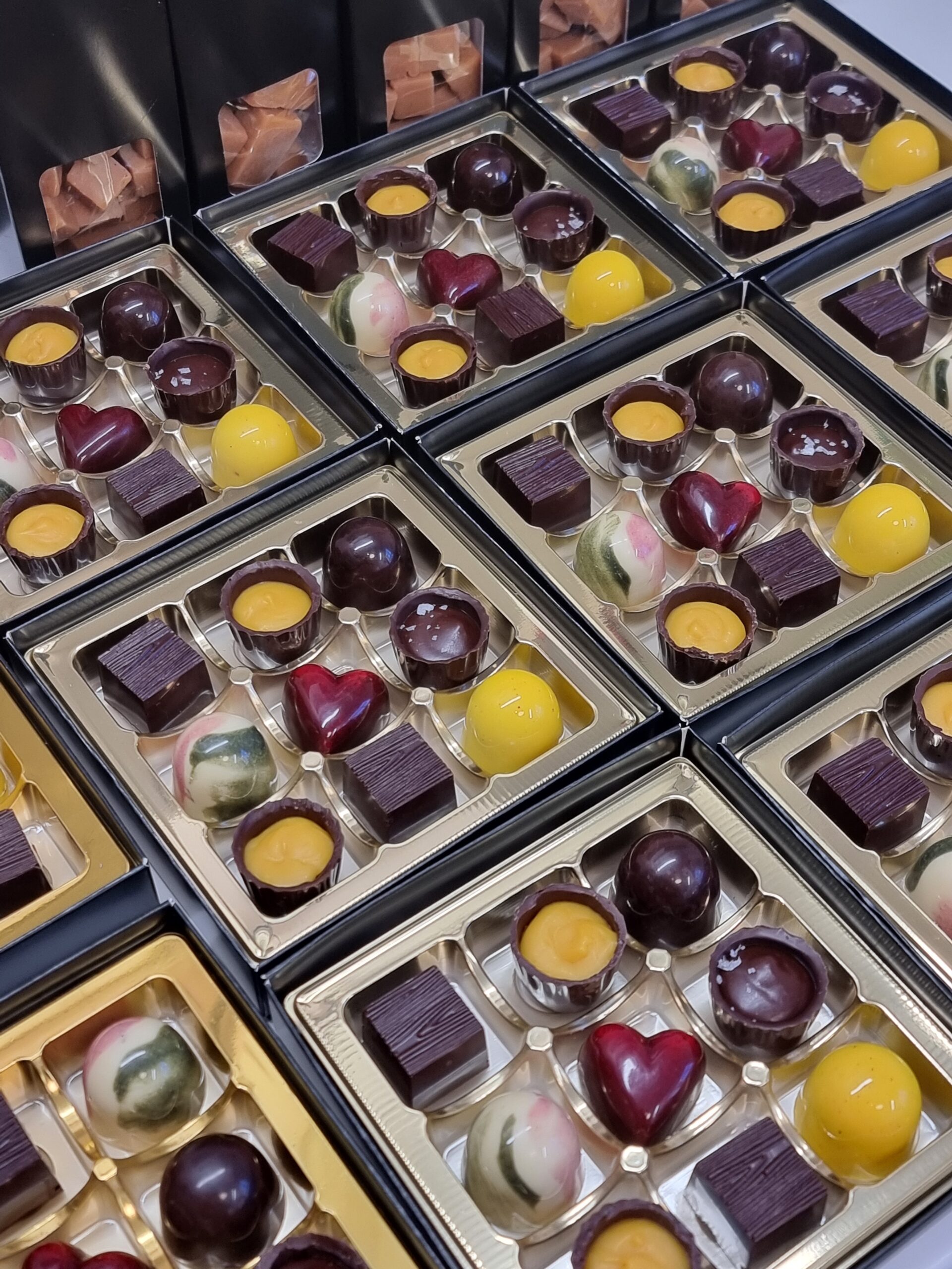 Ingredienser: Mörk choklad* (kakaomassa*, rörsocker*. kakaosmör*), vit choklad* (socker*, kakaosmör*, MJÖLKpulver*, vanilj*), mangopuré, hallonpuré, rabarber, GRÄDDE, socker*, MJÖLKchoklad* (socker*, kakaosmör*, MJÖLKpulver*, kakaomassa*), MANDEL*, sirap*, SMÖR, glukossirap, VETE-mjöl, citronjuice, salt, vaniljsocker*, havssalt, citronzest, gurkmeja*, hallonpulver*, hibiskuspulver*, spirulinapulver*
